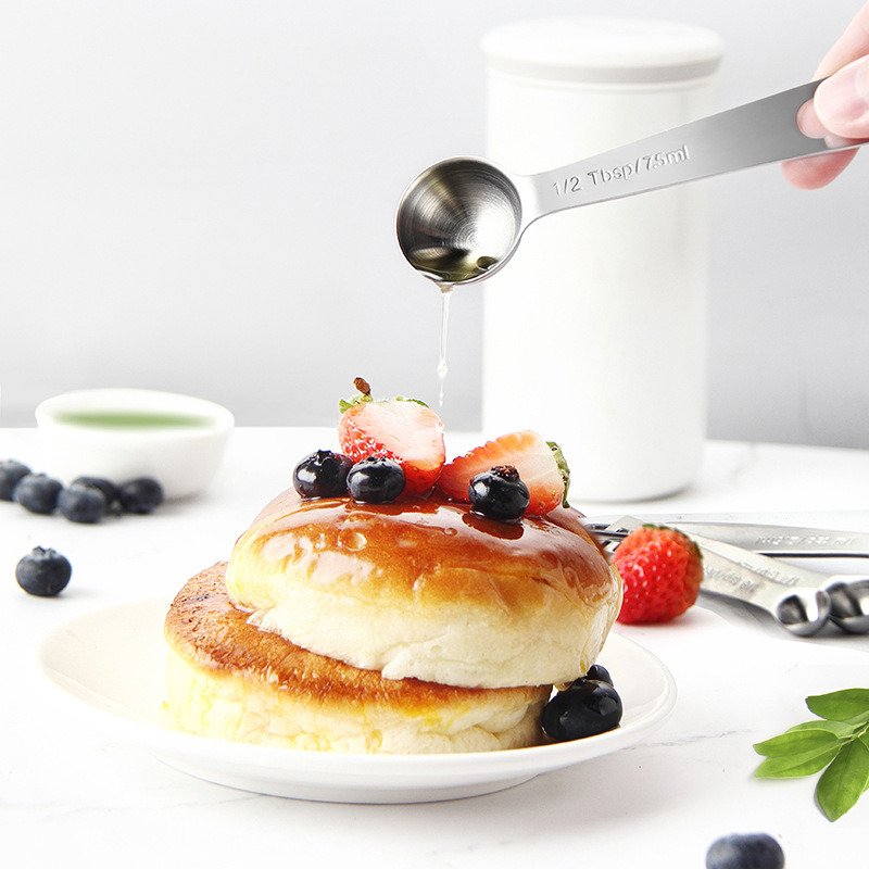 [Etched measurement markings for easy read] If you are tired of having easily-faded painted measurements like 21.52% reviews do; you can turn to deeply-engraved measurement which remain intact after having repeatedly used. This measuring scooper set comes with 1/8 tsp; 1/4 tsp; 1/2 tsp; 1 tsp; 1/2 tbsp and 1 tbsp. Each one gives the ml measurement also.